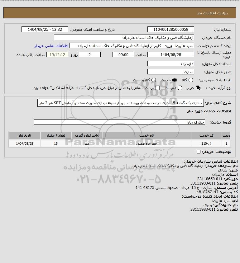 تلفن:5- 88349670 (021) فکس: 88349673 (021) Website: www.ParsNamadData.com E-mail: Info@ParsNamadData.com استعلام حفاری یک گمانه 15 متری در محدوده شهرستان جویبار نمونه برداری بصورت ممتد و آزمایش SPT هر 2 متر