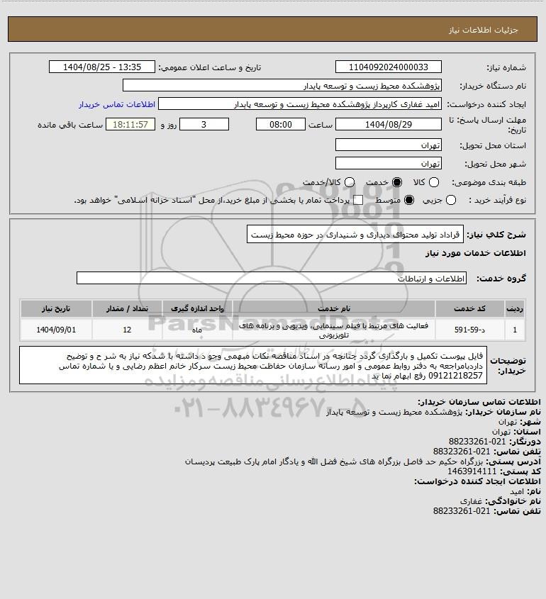 تلفن:5- 88349670 (021) فکس: 88349673 (021) Website: www.ParsNamadData.com E-mail: Info@ParsNamadData.com استعلام قراداد تولید محتوای دیداری و شنیداری در حوزه محیط زیست