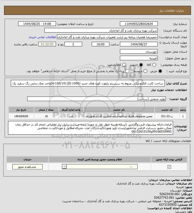 تلفن:5- 88349670 (021) فکس: 88349673 (021) Website: www.ParsNamadData.com E-mail: Info@ParsNamadData.com استعلام ساخت کارت الکترو نیکی مربوط به سیستم پایلوت کوره های جدید (H-100/101)(E-1006)واحد نمک زدایی رگ سفید یک