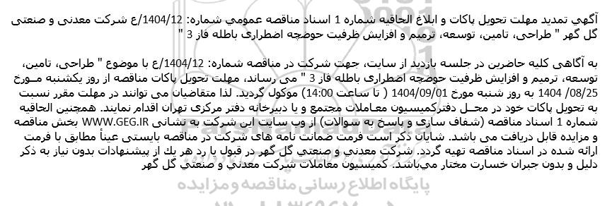 به آگاهی کلیه حاضرین در جلسه بازدید از سایت جهت شرکت در مناقصه شماره 1404/12/ع با موضوع " طراحی، تامین توسعه ترمیم و افزایش ظرفیت حوضچه اضطراری باطله فاز 3 میرساند مهلت تحویل پاکات مناقصه از روز یکشنبه مورخ 1404.8.25 به روز شنبه مورخ 1404.9.1 تا ساعت 14 موکول گردید. لذا متقاضیان میتوانند در مهلت مقرر نسبت به تحویل پاکات خود در محل دفتر کمیسیون معاملات مجتمع و یا دبیرخانه دفتر مرکزی تهران اقدام نمایند. همچنین الحاقیه شماره 1 اسناد مناقصه شفاف سازی و پاسخ به سوالات از وب سایت این شرکت به نشانی WWW.GEG.IR بخش مناقصه و مزایده قابل دریافت میباشد. شایان ذکر است فرمت ضمانت نامه های شرکت در مناقصه بایستی عیناً مطابق با فرمت ارائه شده در اسناد مناقصه تهیه گردد. شرکت معدنی و صنعتی گل گهر در قبول یا رد هر یک از پیشنهادات بدون نیاز به ذکر دلیل و بدون جبران خسارت مختار میباشد کمیسیون معاملات شرکت معدنی و صنعتی گل گهر