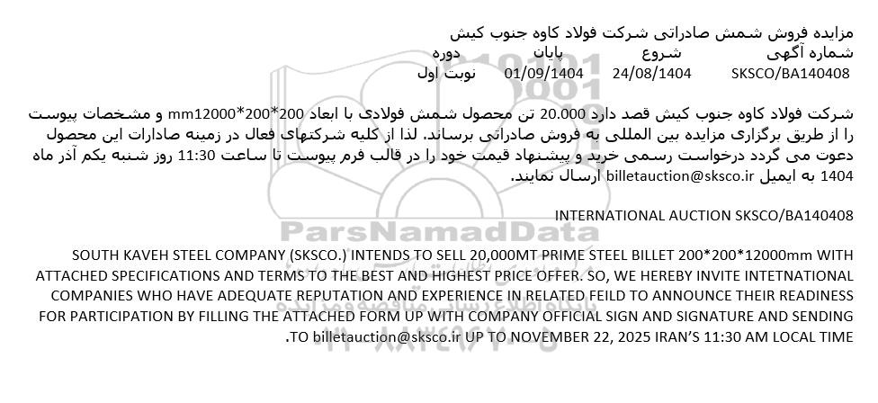 .TO billetauction@sksco.ir UP TO NOVEMBER 22, 2025 IRAN'S 11:30 AM LOCAL TIME