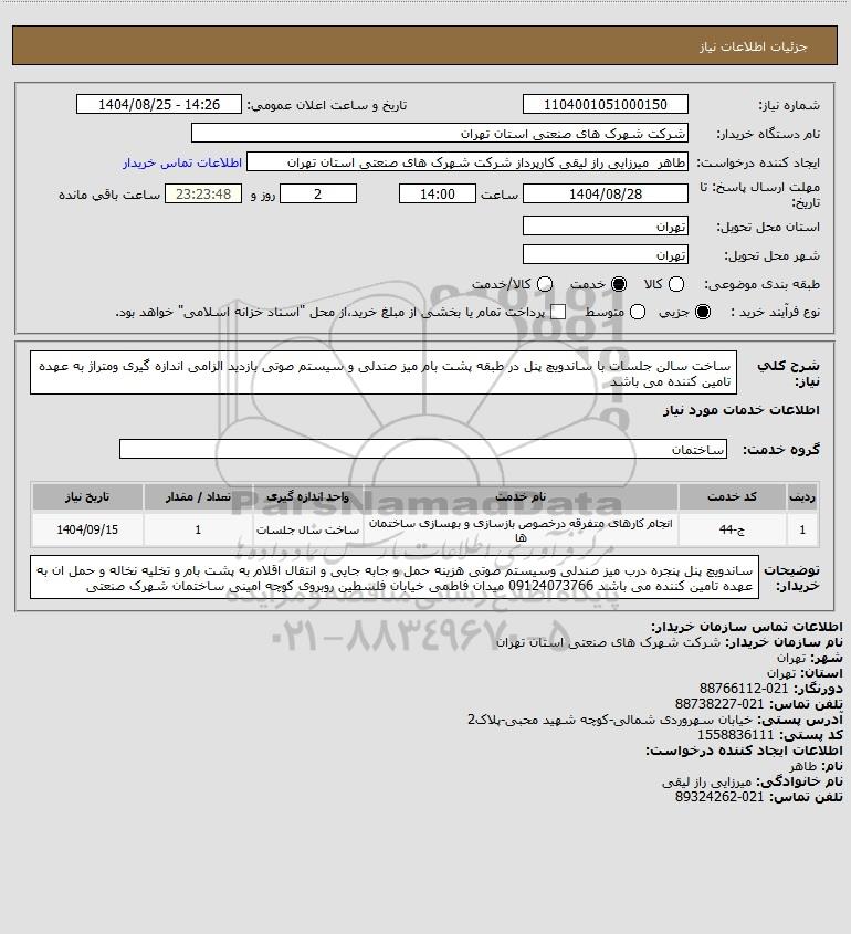 تلفن:5- 88349670 (021) فکس: 88349673 (021) Website: www.ParsNamadData.com E-mail: Info@ParsNamadData.com استعلام ساخت سالن جلسات با ساندویچ پنل در طبقه پشت بام میز صندلی و سیستم صوتی بازدید الزامی اندازه گیری ومتراژ به عهده تامین کننده می باشد