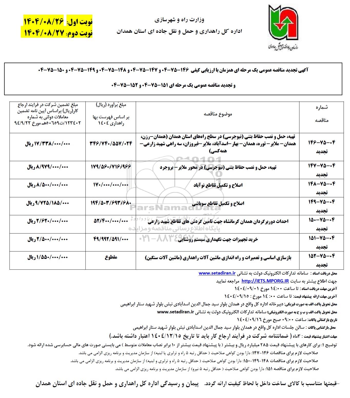 آگهی تجدید مناقصه عمومی یک مرحله ای همزمان با ارزیابی کیفی 146-75-04 و 147-75-04 و 148- 75-04 و 149-75-04 و 150-75-04 و تجدید مناقصه عمومی یک مرحله ای 151-75-04 و 152-75-04