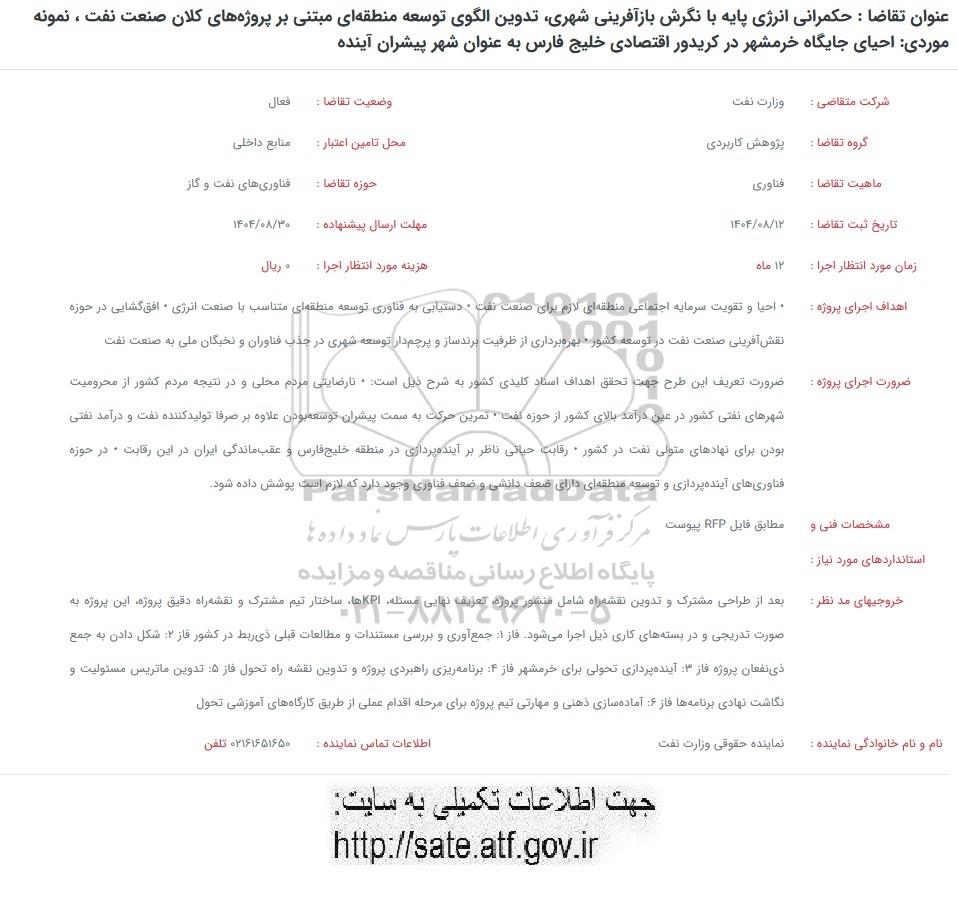 | عنوان آگهی: فراخوان حکمرانی انرژی پایه با نگرش بازآفرینی شهری تدوین الگوی توسعه منطقه ای مبتنی بر پروژه های کلان صنعت نفت ... |