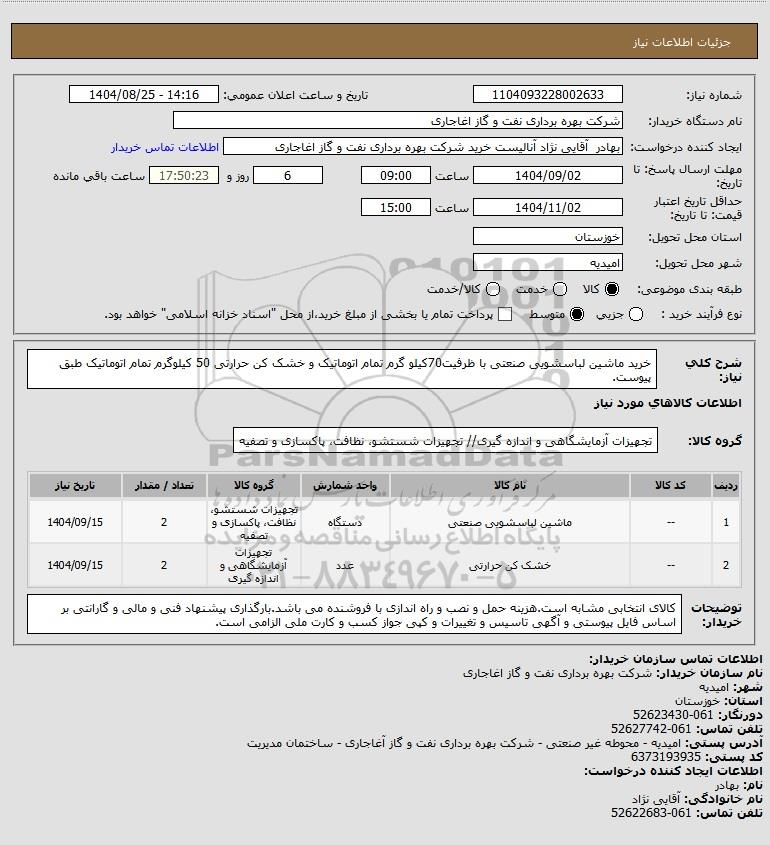 تلفن:5- 88349670 (021) فکس: 88349673 (021) Website: www.ParsNamadData.com E-mail: Info@ParsNamadData.com استعلام خرید ماشین لباسشویی صنعتی با ظرفیت70کیلو گرم تمام اتوماتیک و خشک کن حرارتی 50 کیلوگرم تمام اتوماتیک طبق پیوست.