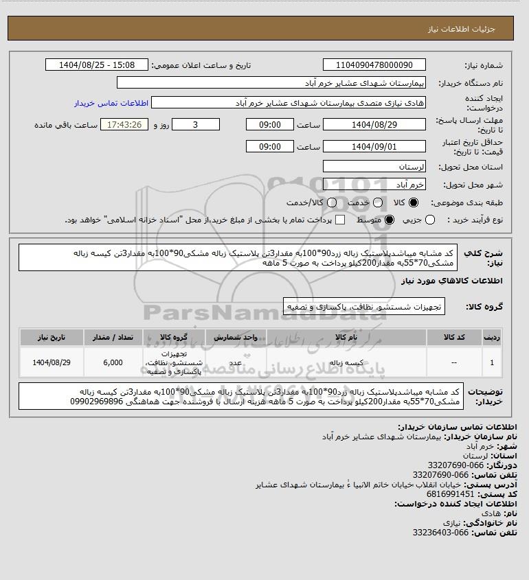 تلفن:5- 88349670 (021) فکس: 88349673 (021) Website: www.ParsNamadData.com E-mail: Info@ParsNamadData.com استعلام کد مشابه میباشدپلاستیک زباله زرد90*100به مقدار3تن پلاستیک زباله مشکی90*100به مقدار3تن کیسه زباله مشکی70*55به مقدار200کیلو پرداخت به صورت 5 ماهه