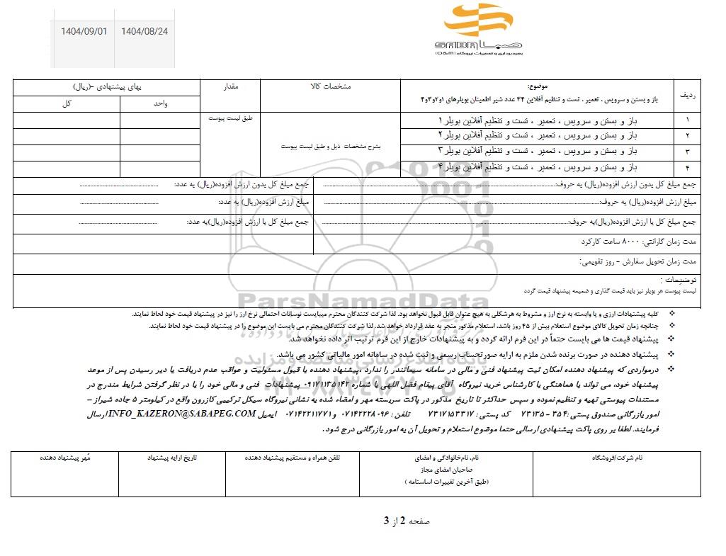 توضیحات: لیست پیوست هر بویلر نیز باید قیمت گذاری و ضمیمه پیشنهاد قیمت گردد