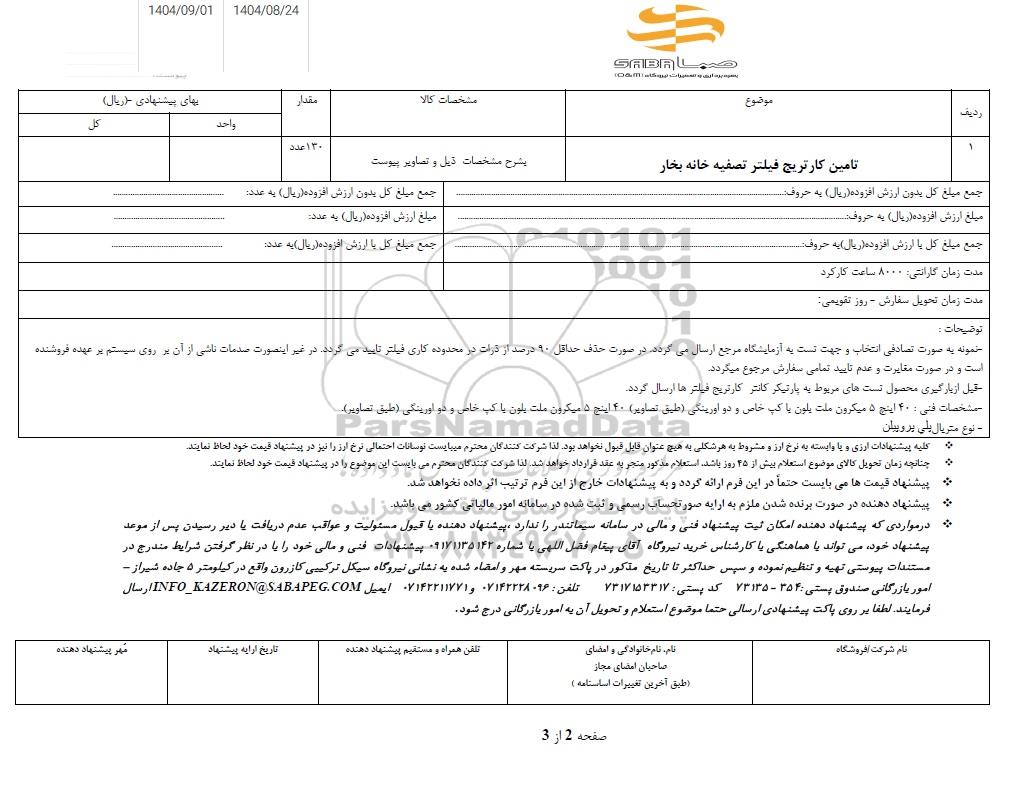 | عنوان آگهی: استعلام تامین کارتریج فیلتر تصفلیه خانه بخار |