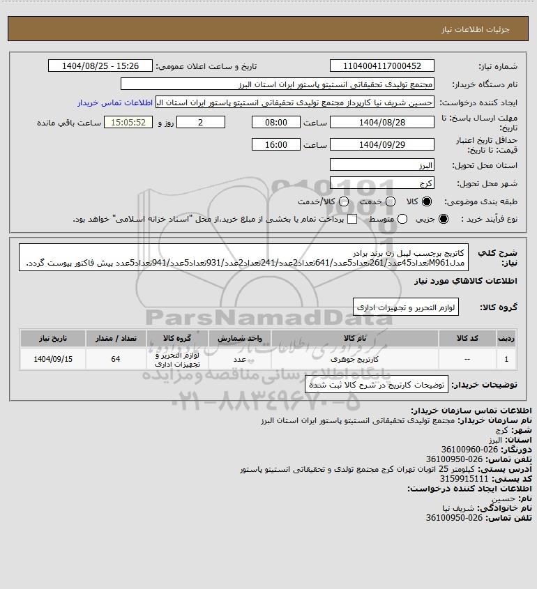 تلفن:5- 88349670 (021) فکس: 88349673 (021) Website: www.ParsNamadData.com E-mail: Info@ParsNamadData.com استعلام کاتریج برچسب لیبل زن برند برادر مدلM961تعداد45عدد/261تعداد5عدد/641تعداد2عدد/241تعداد2عدد/931تعداد5عدد/941تعداد5عدد