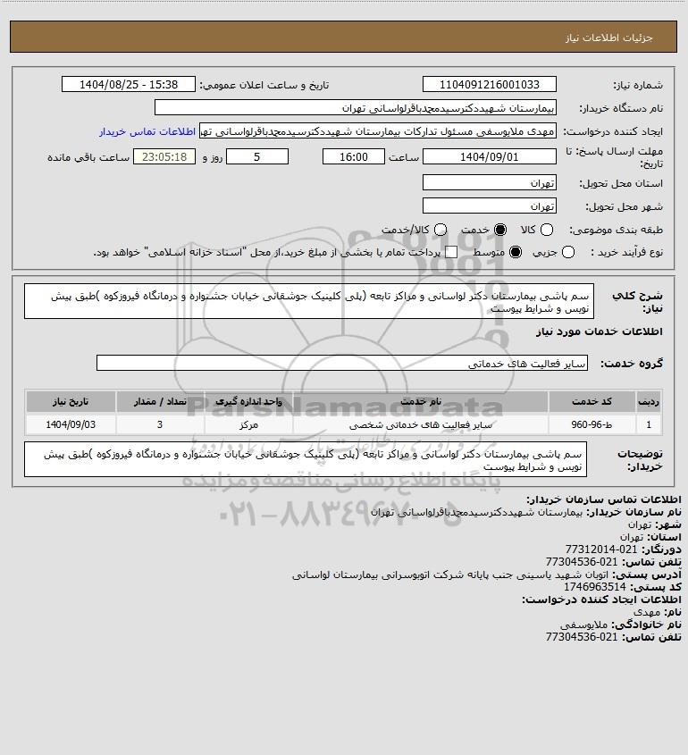 تلفن:5- 88349670 (021) فکس: 88349673 (021) Website: www.ParsNamadData.com E-mail: Info@ParsNamadData.com استعلام سم پاشی بیمارستان دکتر لواسانی و مراکز تابعه (پلی کلینیک جوشقانی خیابان جشنواره و درمانگاه فیروزکوه )طبق پیش نویس و شرایط پیوست