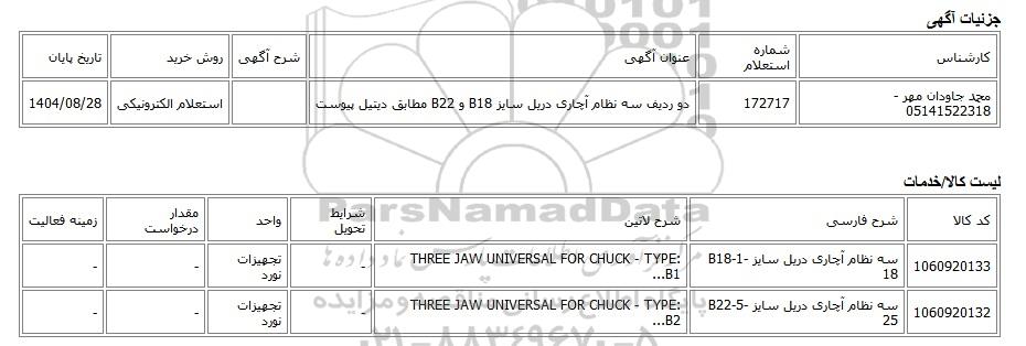 تلفن:5- 88349670 (021) فکس: 88349673 (021) Website: www.ParsNamadData.com E-mail: Info@ParsNamadData.com استعلام الکترونیکی دو ردیف سه نظام آچاری دریل سایز B18 و B22 مطابق دیتیل پیوست