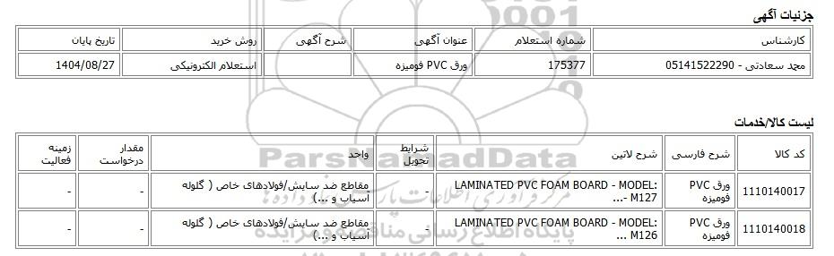 تلفن:5- 88349670 (021) فکس: 88349673 (021) Website: www.ParsNamadData.com E-mail: Info@ParsNamadData.com استعلام الکترونیکی ورق PVC فومیزه