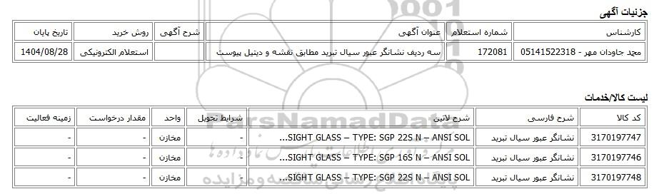 تلفن:5- 88349670 (021) فکس: 88349673 (021) Website: www.ParsNamadData.com E-mail: Info@ParsNamadData.com استعلام الکترونیکی سه ردیف نشانگر عبور سیال تبرید مطابق نقشه و دیتیل پیوست