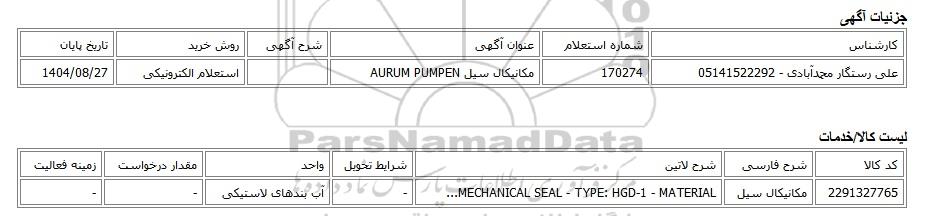 تلفن:5- 88349670 (021) فکس: 88349673 (021) Website: www.ParsNamadData.com E-mail: Info@ParsNamadData.com استعلام الکترونیکی مکانیکال سیل AURUM PUMPEN