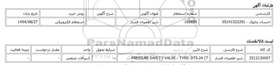 تلفن:5- 88349670 (021) فکس: 88349673 (021) Website: www.ParsNamadData.com E-mail: Info@ParsNamadData.com استعلام الکترونیکی شیر اطمینان فشار