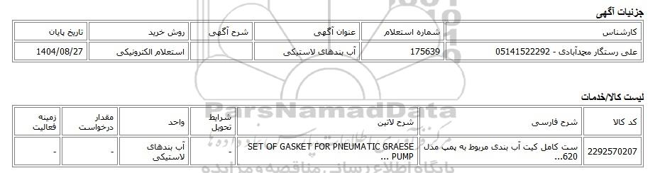 تلفن:5- 88349670 (021) فکس: 88349673 (021) Website: www.ParsNamadData.com E-mail: Info@ParsNamadData.com استعلام الکترونیکی آب بندهای لاستیکی