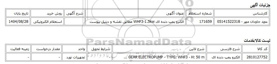 محمد جاودان مهر - 05141522318171659الکترو پمپ دنده ای WHF3-1.5kw مطابق نقشه و دیتیل پیوستاستعلام الکترونیکی1404/08/28