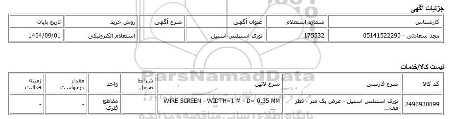 تلفن:5- 88349670 (021) فکس: 88349673 (021) Website: www.ParsNamadData.com E-mail: Info@ParsNamadData.com استعلام الکترونیکی توری استنلس استیل