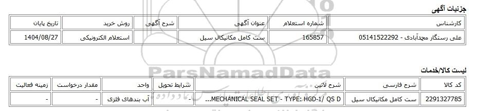 تلفن:5- 88349670 (021) فکس: 88349673 (021) Website: www.ParsNamadData.com E-mail: Info@ParsNamadData.com استعلام الکترونیکی ست کامل مکانیکال سیل
