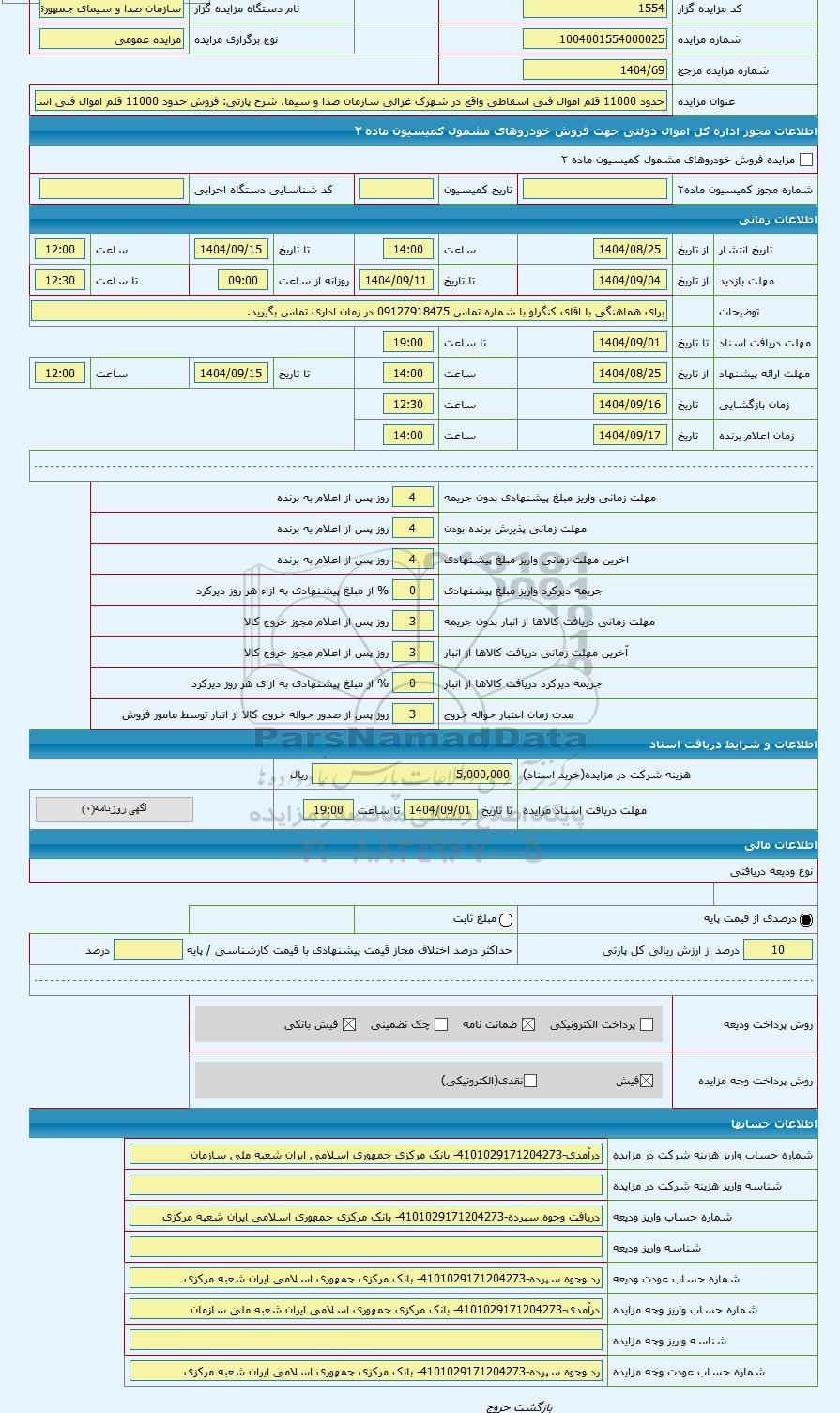 تلفن:5- 88349670 (021) فکس: 88349673 (021) Website: www.ParsNamadData.com E-mail: Info@ParsNamadData.com مزایده فروش حدود 11000 قلم اموال فنی اسقاطی شامل:اموال انفورماتیکیتجهیزات تأسیساتی و تجهیزات صدا و تصویر و... واقع در انبار ب
