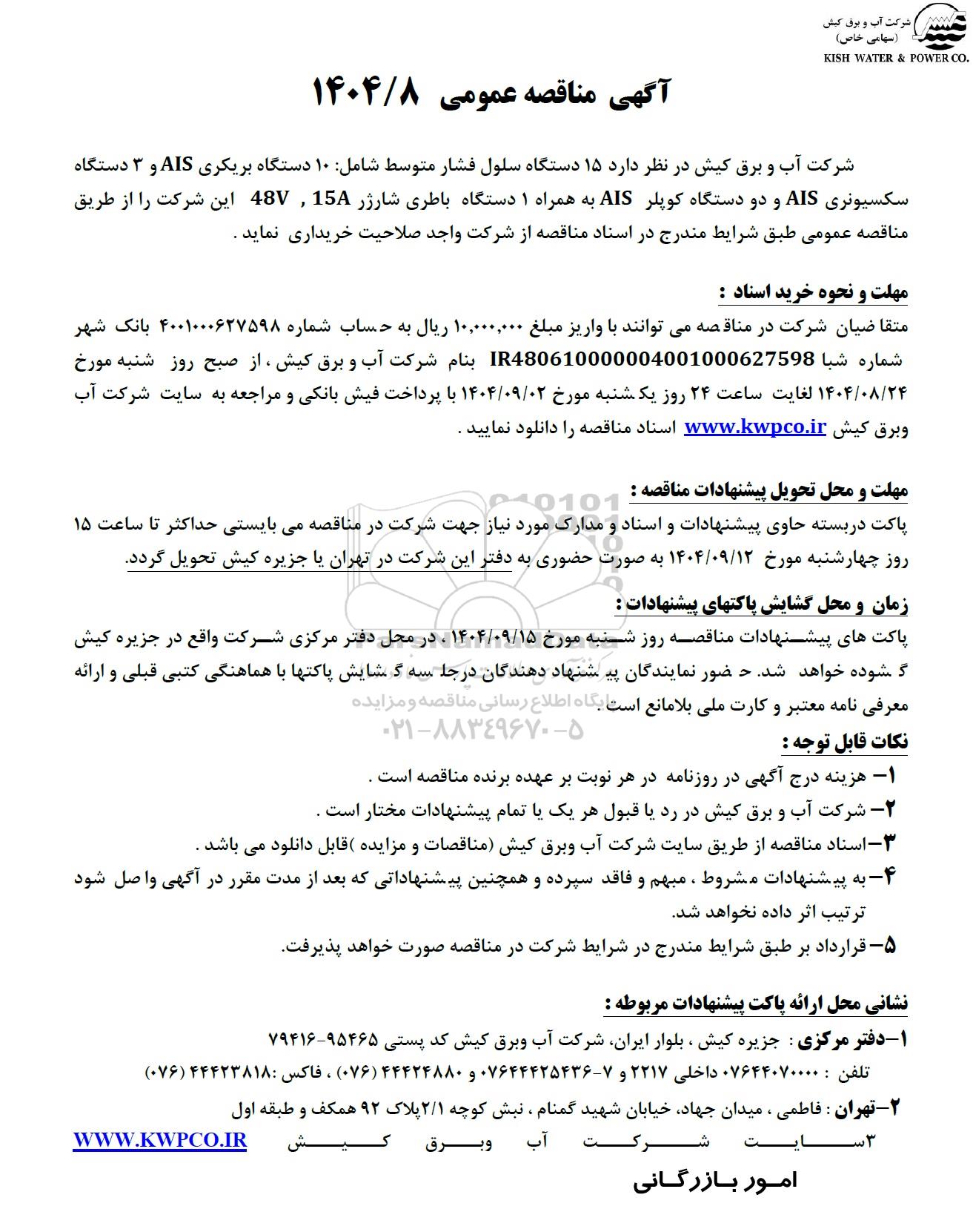 شرکت آب و برق کیش در نظر دارد 15 دستگاه سلول فشار متوسط شامل: 10 دستگاه بریکری AIS و 3 دستگاه سکسیونری AIS و دو دستگاه کوپلر AIS به همراه 1 دستگاه باطری شارژر 48V,15A این شرکت را از طریق مناقصه عمومی طبق شرایط مندرج در اسناد مناقصه از شرکت واجد صلاحیت خریداری نماید.