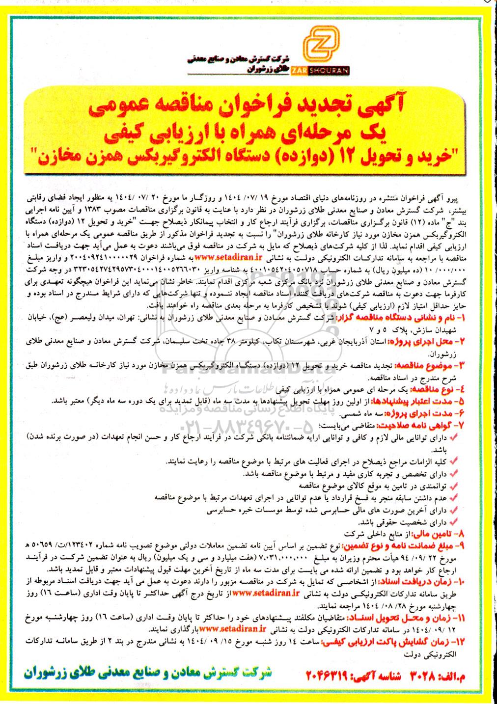 پیرو آگهی فراخوان منتشره در روزنامه های دنیای اقتصاد مورخ 1404.07.19 و روزگار ما مورخ 1404.07.20 به منظور ایجاد فضای رقابتی بیشتر، شرکت گسترش معادن و صنایع معدنی طلای زرشوران در نظر دارد با عنایت به قانون برگزاری مناقصات مصوب 1383 و آیین نامه اجرایی بند "ج" ماده (12) قانون برگزاری مناقصات، برگزاری فرآیند ارجاع کار و انتخاب پیمانکار ذیصلاح جهت "خرید و تحویل 12 (دوازده) دستگاه الکتروگیربکس همزن مخازن مورد نیاز کارخانه طلای زرشوران " را نسبت به تجدید فراخوان مذکور از طریق مناقصه عمومی یک مرحله ای همراه با ارزیابی کیفی انجام دهد. لذا از کلیه شرکت های ذیصلاح که مایل به شرکت در مناقصه فوق می باشند دعوت به عمل می آید جهت دریافت اسناد مناقصه با مراجعه به سامانه تدارکات الکترونیکی دولت به نشانی (ستاد ایران) به شماره فراخوان 2004092410000029 و واریز مبلغ 10.000.000 (ده میلیون ریال) به شماره حساب 4001054204050718 به شناسه واریز 323054274295730400014005266030 در وجه شرکت گسترش معادن و صنایع معدنی طلای زرشوران نزد بانک مرکزی شعبه مرکزی اقدام نمایند. خاطر نشان می نماید این فراخوان هیچ گونه تعهدی برای کارفرما جهت دعوت به مناقصه شرکت های دریافت کننده اسناد مناقصه ایجاد ننموده و تنها شرکت هایی که دارای شرایط مندرج در اسناد بوده و حایز حداقل امتیاز لازم (ارزیابی کیفی) شوند با تشخیص کارفرما به مرحله بعدی مناقصه راه خواهند یافت.