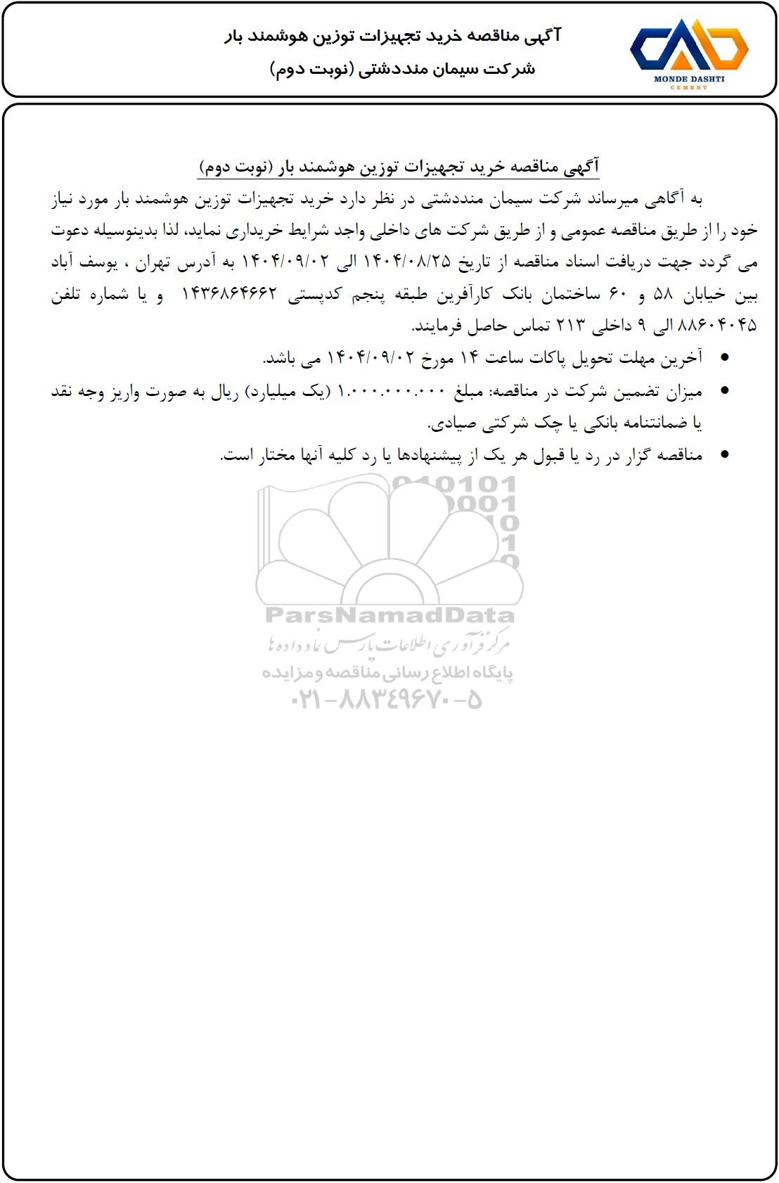 تلفن:5- 88349670 (021) فکس: 88349673 (021) Website: www.ParsNamadData.com E-mail: Info@ParsNamadData.com مناقصه خرید تجهیزات توزین هوشمند بار - نوبت دوم