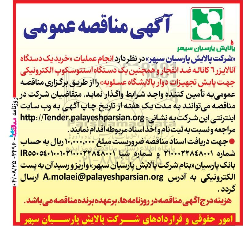 تلفن:5- 88349670 (021) فکس: 88349673 (021) Website: www.ParsNamadData.com E-mail: Info@ParsNamadData.com مناقصه خرید یک دستگاه آنالایزر 6 کاناله ضد انفجار و همچنین یک دستگاه استتوسکوپ الکترونیکی...