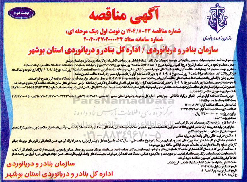 موضوع مناقصه : انجام تعمیرات سرویس نگهداری و توسعه تجهیزات مرکز تلفن شبکه ارتباطی و زیرساخت کابلی اداره کل بنادر و دریانوردی استان بوشهر