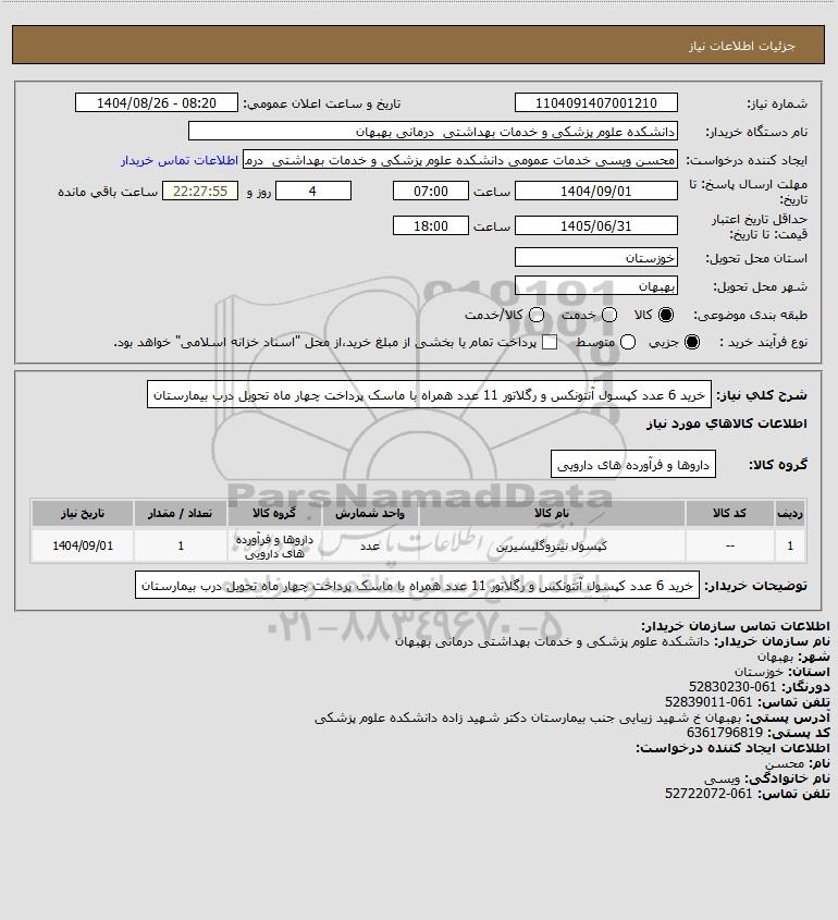 تلفن:5- 88349670 (021) فکس: 88349673 (021) Website: www.ParsNamadData.com E-mail: Info@ParsNamadData.com استعلام خرید 6 عدد کپسول آنتونکس و رگلاتور 11 عدد همراه با ماسک پرداخت چهار ماه تحویل درب بیمارستان