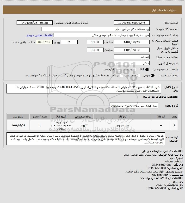 تلفن:5- 88349670 (021) فکس: 88349673 (021) Website: www.ParsNamadData.com E-mail: Info@ParsNamadData.com استعلام خرید 4200 عددرول کاغذ حرارتی 8 سانت 45متری و 300رول لیبل 4MTHGL-1545 تک ردیفه رول 2000 عددی حرارتی با مشخصات فنی طبق لیست پیوست.