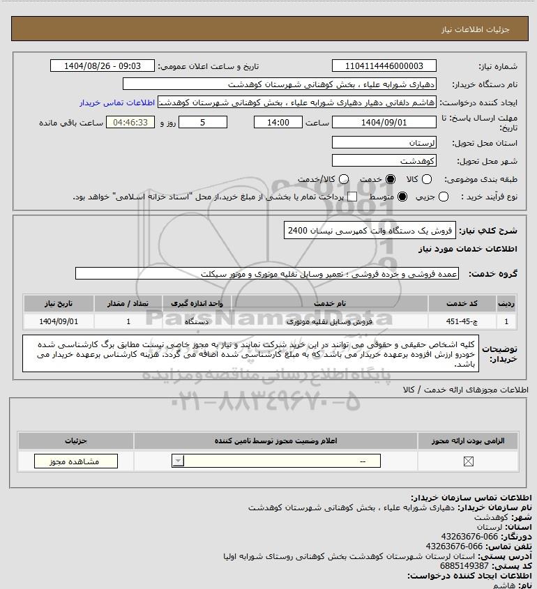 تلفن:5- 88349670 (021) فکس: 88349673 (021) Website: www.ParsNamadData.com E-mail: Info@ParsNamadData.com استعلام فروش یک دستگاه وانت کمپرسی نیسان 2400