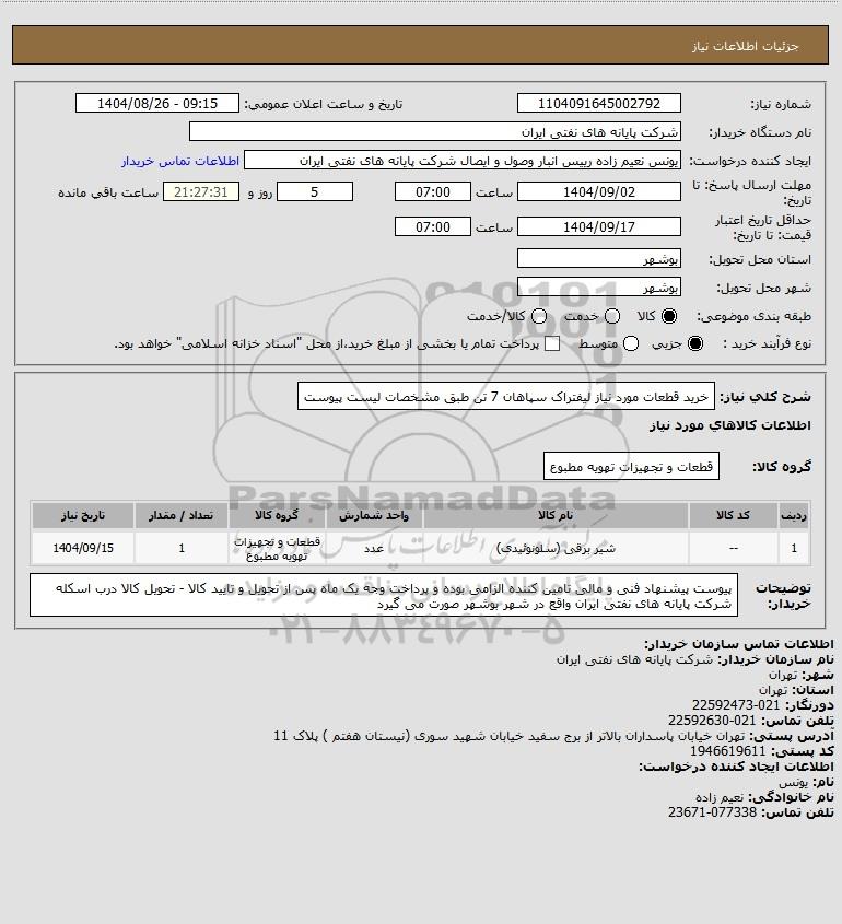 تلفن:5- 88349670 (021) فکس: 88349673 (021) Website: www.ParsNamadData.com E-mail: Info@ParsNamadData.com استعلام خرید قطعات مورد نیاز لیفتراک سپاهان 7 تن طبق مشخصات لیست پیوست