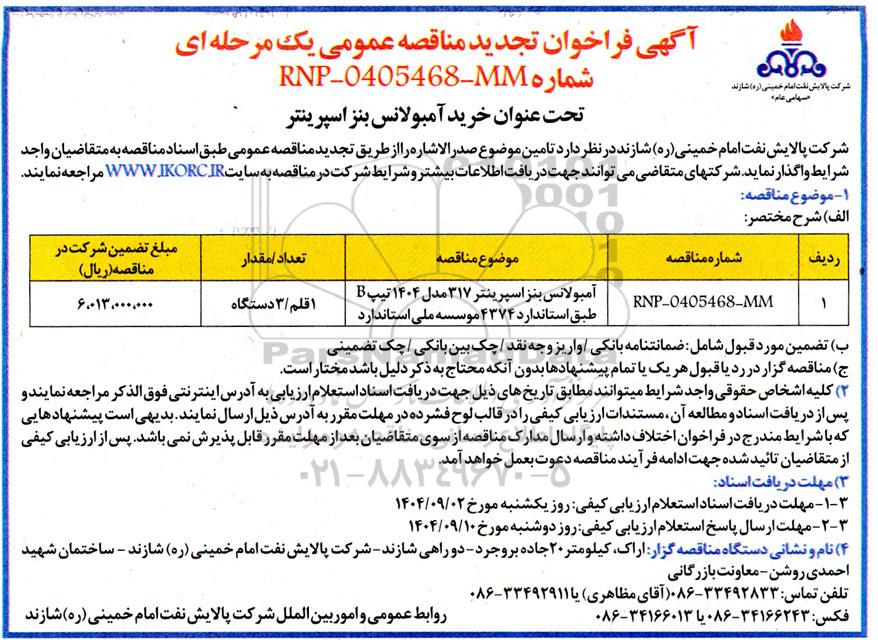 آگهی فراخوان تجدید مناقصه عمومی یک مرحله ای شماره RNP- 0405468 -MM