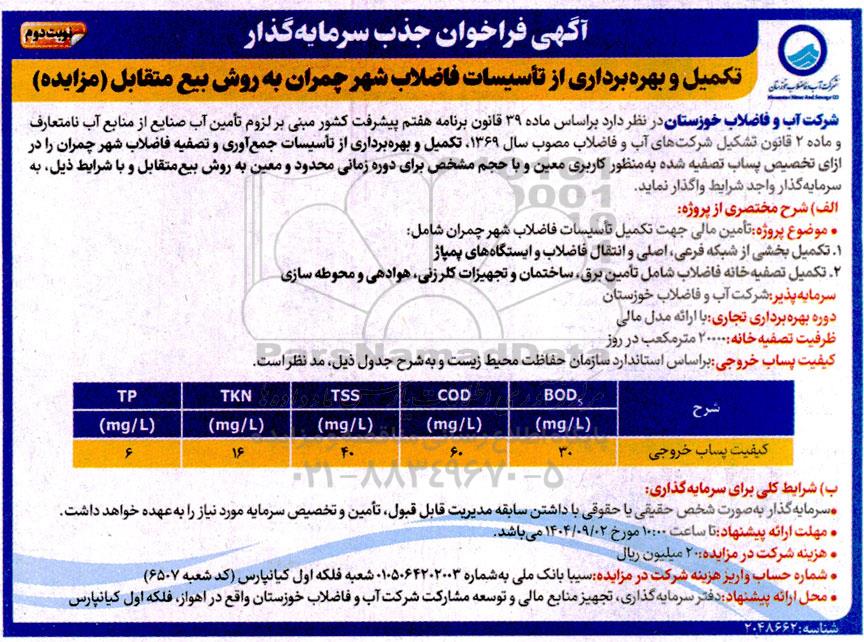 شرکت آب و فاضلاب خوزستان در نظر دارد بر اساس ماده 39 قانون برنامه هفتم پیشرفت کشور مبنی بر لزوم تامین آب صنایع از منابع آب نامتعارف و ماده 2 قانون تشکیل شرکتهای آب و فاضلاب مصوب سال 1369 تکمیل و بهره برداری از تاسیسات جمع آوری و تصفیه فاضلاب شهر چمران را در ازای تخصیص پساب تصفیه شده به منظور کاربری معین و با حجم مشخص برای دوره زمانی محدود و معین به روش بیع متقابل و با شرایط ذیل به سرمایه گذار واجد شرایط واگذار نماید.