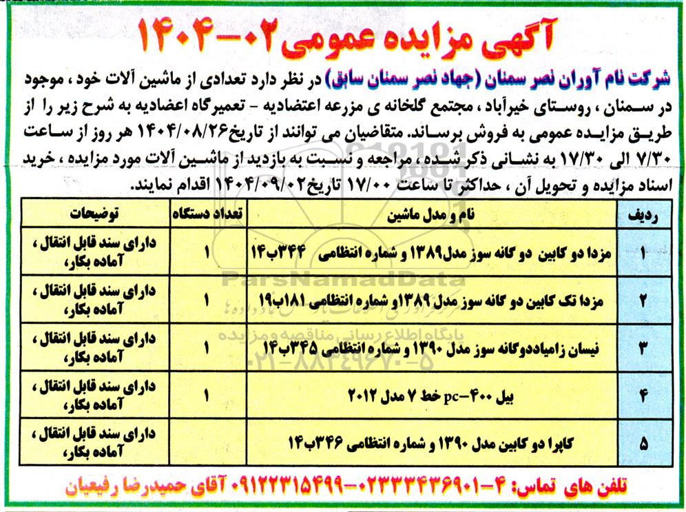 شرکت نام آوران نصر سمنان (جهاد نصر سمنان سابق) در نظر دارد تعدادی از ماشین آلات خود موجود در سمنان، روستای خیرآباد، مجتمع گلخانه مزرعه اعتضادیه - تعمیرگاه اعتضادیه به شرح زیر از طریق مزایده عمومی به فروش برساند. متقاضیان می توانند از تاریخ 1404.8.26 هر روز از ساعت 7/30 الی 17/30 به نشانی ذکر شده، مراجعه و نسبت به بازدید از ماشین آلات مورد مزایده، خرید اسناد مزایده و تحویل آن، حداکثر تا ساعت 17 تاریخ 1404.09.02 اقدام نمایند.