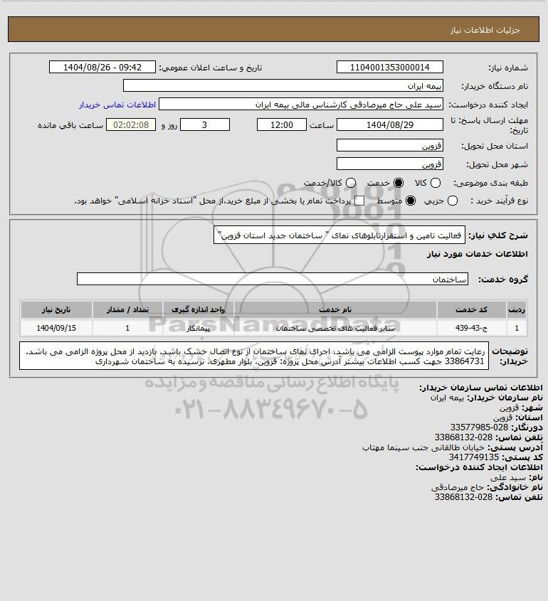 تلفن:5- 88349670 (021) فکس: 88349673 (021) Website: www.ParsNamadData.com E-mail: Info@ParsNamadData.com استعلام فعالیت تامین و استقرارتابلوهای نمای " ساختمان جدید استان قزوین"