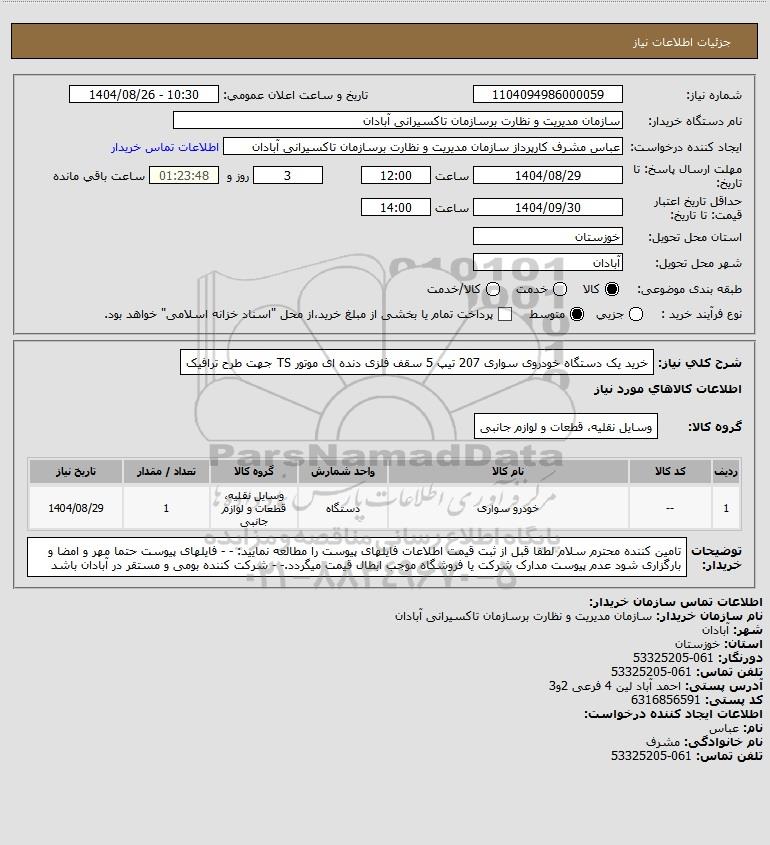 تلفن:5- 88349670 (021) فکس: 88349673 (021) Website: www.ParsNamadData.com E-mail: Info@ParsNamadData.com استعلام خرید یک دستگاه خودروی سواری 207 تیپ 5 سقف فلزی دنده ای موتور TS جهت طرح ترافیک