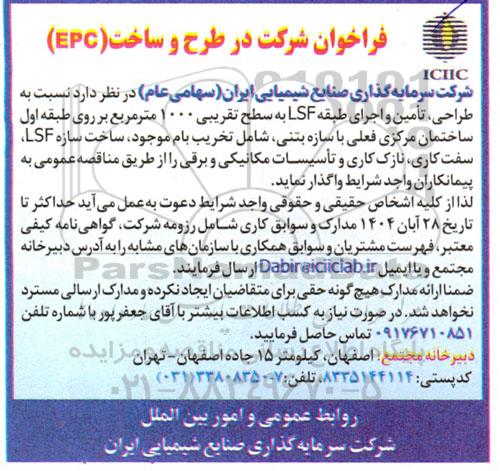 شرکت سرمایه گذاری صنایع شیمیایی ایران (سهامی عام) در نظر دارد نسبت به طراحی، تامین و اجرای طبقه LSF به سطح تقریبی 1000 متر مربع بر روی طبقه اول ساختمان مرکزی فعلی با سازه بتنی ،شامل تخریب بام موجود، ساخت سازه LSF ، سفت کاری نازک کاری و تاسیسات مکانیکی و برقی را از طریق مناقصه عمومی به پیمانکاران واجد شرایط واگذار نماید.