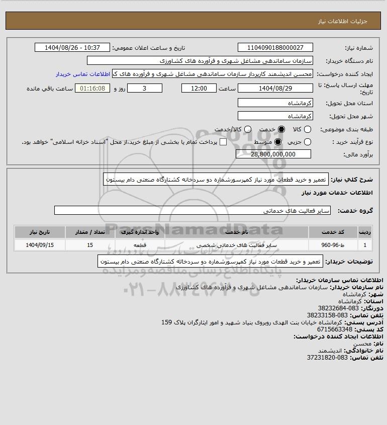 تلفن:5- 88349670 (021) فکس: 88349673 (021) Website: www.ParsNamadData.com E-mail: Info@ParsNamadData.com استعلام تعمیر و خرید قطعات مورد نیاز کمپرسورشماره دو سردخانه کشتارگاه صنعتی دام بیستون