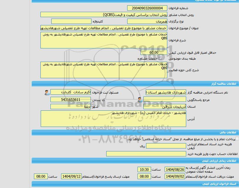 تلفن:5- 88349670 (021) فکس: 88349673 (021) Website: www.ParsNamadData.com E-mail: Info@ParsNamadData.com مناقصه خرید خدمات مشاوره خدمات مشاور با موضوع طرح تفصیلی انجام مطالعات تهیه طرح تفصیلی شهرهادیشهر به روش QBS