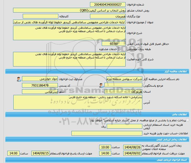 خرید خدمات مشاوره ارایه خدمات طراحی مفهومی ساماندهی کریدور خطوط لوله فرآورده های نفتی از سایت شمالی تا اسکله شرقی منطقه ویژه خلیج فارس |