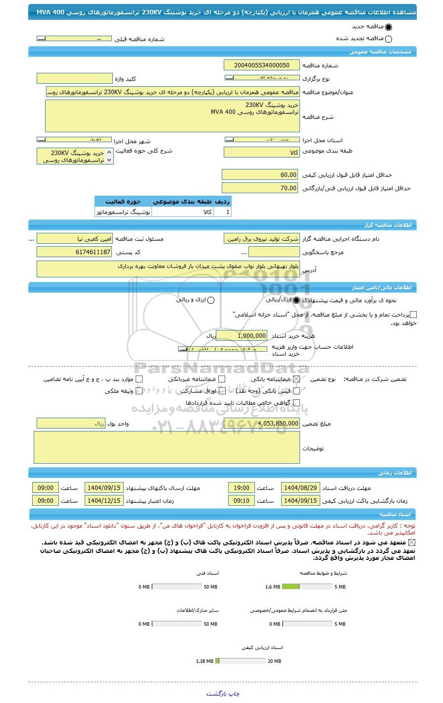 مناقصه مناقصه عمومی همزمان با ارزیابی (یکپارچه) دو مرحله ای خرید بوشینگ 230KV ترانسفورماتورهای روسی 400 MVA