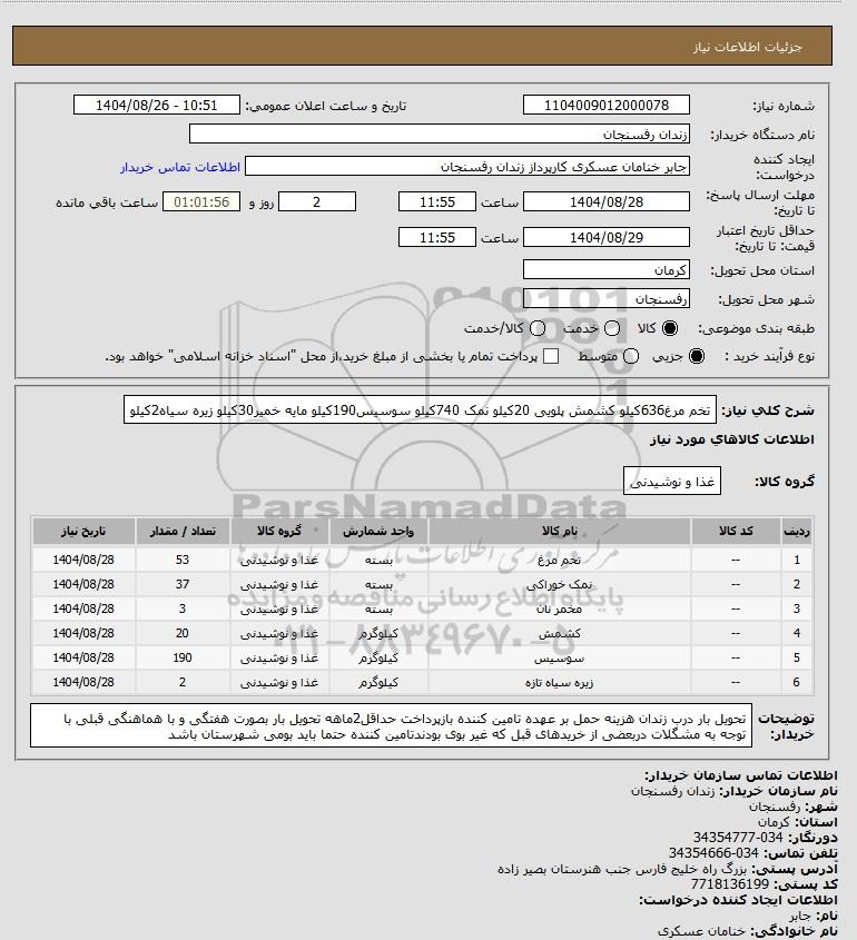 تلفن:5- 88349670 (021) فکس: 88349673 (021) Website: www.ParsNamadData.com E-mail: Info@ParsNamadData.com استعلام تخم مرغ636کیلو کشمش پلویی 20کیلو نمک 740کیلو سوسیس190کیلو مایه خمیر30کیلو زیره سیاه2کیلو