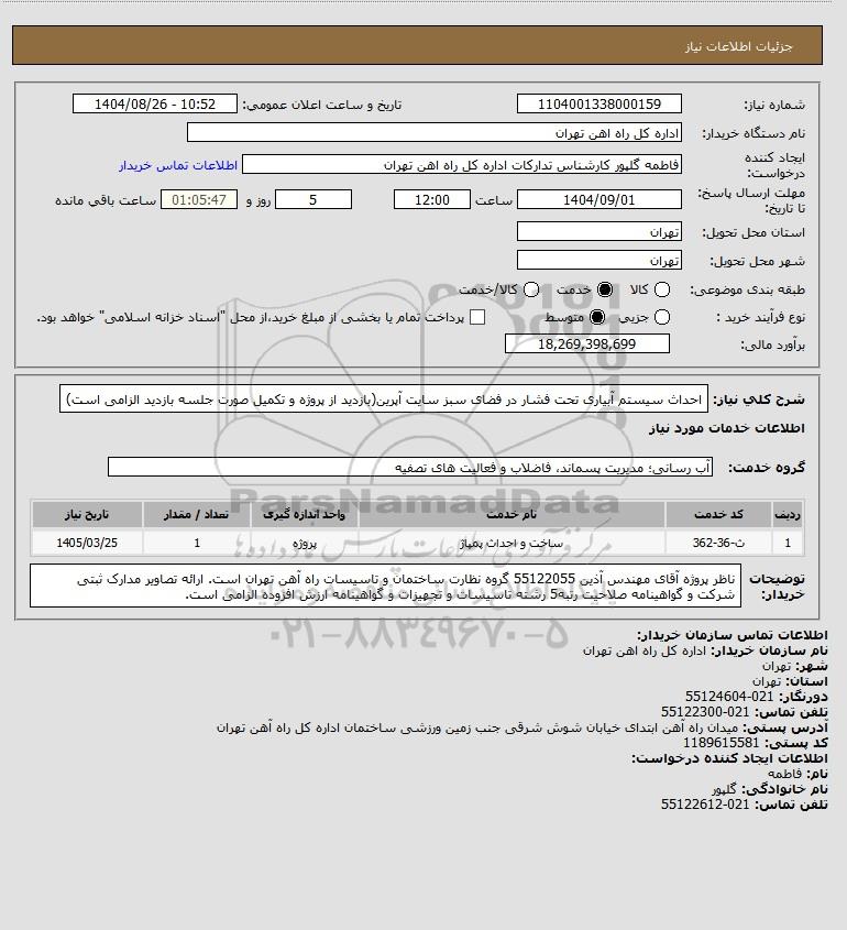 تلفن:5- 88349670 (021) فکس: 88349673 (021) Website: www.ParsNamadData.com E-mail: Info@ParsNamadData.com استعلام احداث سیستم آبیاری تحت فشار در فضای سبز سایت آپرین(بازدید از پروژه و تکمیل صورت جلسه بازدید الزامی است)