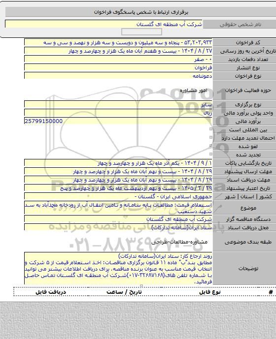تلفن:5- 88349670 (021) فکس: 88349673 (021) Website: www.ParsNamadData.com E-mail: Info@ParsNamadData.com مناقصه استعلام قیمت: مطالعات پایه سامانه و تامین انتقال آب از رودخانه محمدآباد به سد شهید دستغیب