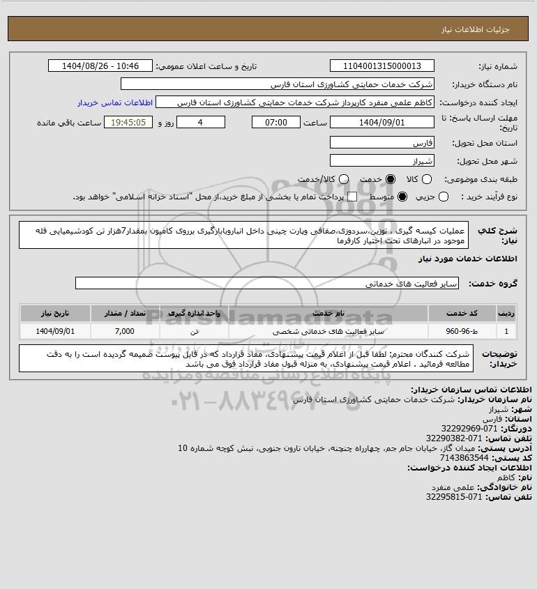 تلفن:5- 88349670 (021) فکس: 88349673 (021) Website: www.ParsNamadData.com E-mail: Info@ParsNamadData.com استعلام عملیات کیسه گیری توزینسردوزیصفافی وپارت چینی داخل انباروبابارگیری برروی کامیون بمقدار7هزار تن کودشیمیایی فله موجود در انبارهای تحت اختیار کارفرما