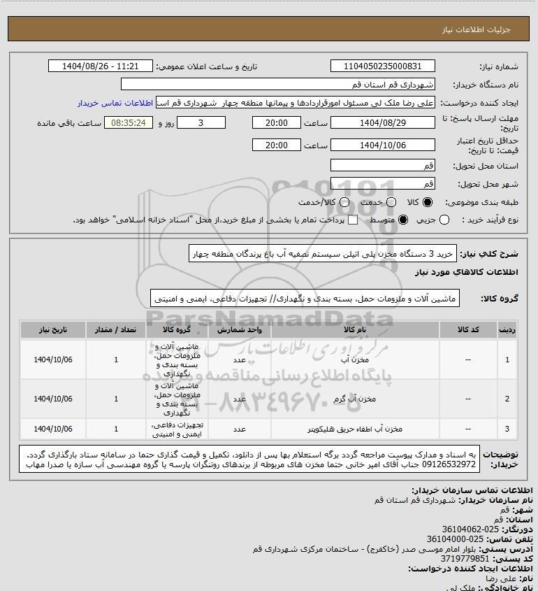 تلفن:5- 88349670 (021) فکس: 88349673 (021) Website: www.ParsNamadData.com E-mail: Info@ParsNamadData.com استعلام خرید 3 دستگاه مخزن پلی اتیلن سیستم تصفیه آب باغ پرندگان منطقه چهار