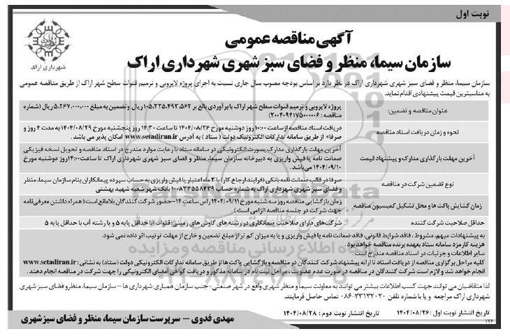 سازمان سیما، منظر و فضای سبز شهری شهرداری اراک در نظر دارد بر اساس بودجه مصوب سال جاری نسبت به اجرای پروژه لایروبی و ترمیم قنوات سطح شهر اراک از طریق مناقصه عمومی به مناسبترین قیمت پیشنهادی اقدام نماید.