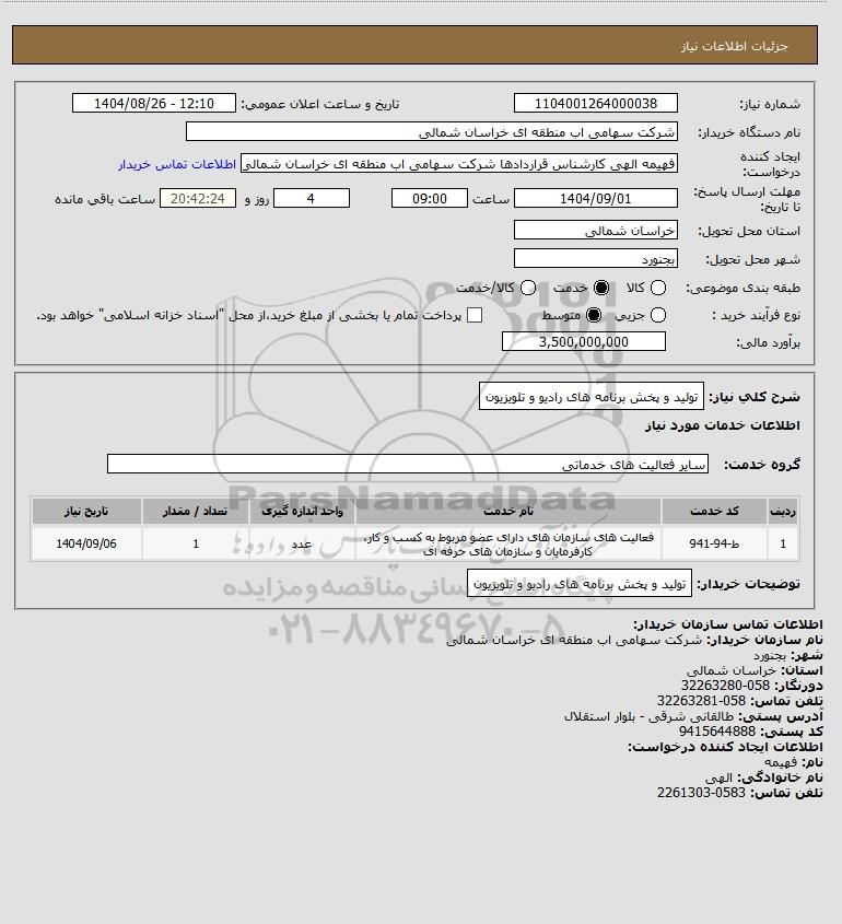 تلفن:5- 88349670 (021) فکس: 88349673 (021) Website: www.ParsNamadData.com E-mail: Info@ParsNamadData.com استعلام تولید و پخش برنامه های رادیو و تلویزیون